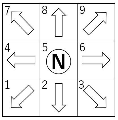 8方向の矢印に、ニュートラルのNを加えた9方向が、方向キー入力の基本となります!