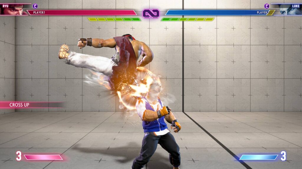 しかし、めくり攻撃をされた瞬間(画像2枚目)、リュウは左側にいます。