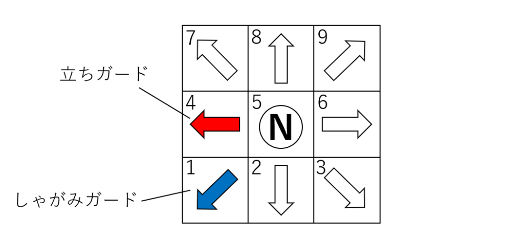相手から離れるように真後ろに入力する、すなわち4に入力すると立ちガードができ、相手と反対側の斜め下、すなわち1に入力するとしゃがみガードとなります。
