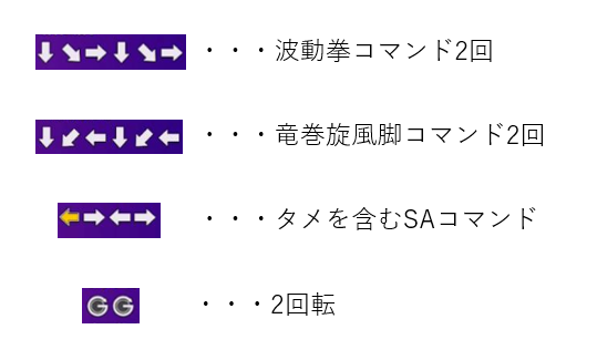 波動拳コマンドの必殺技のあとに真空竜巻コマンドのSAを打つコンボや、小技から素早くコマンド入力をしてSAを出さなければならないコンボもあります。