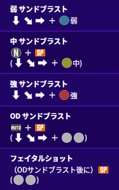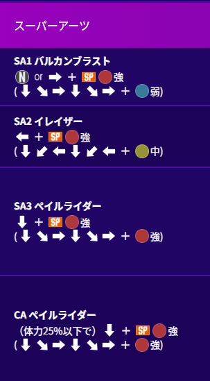 • 必殺技やSAをコマンド入力なしでも打てるが、威力は少し下がる