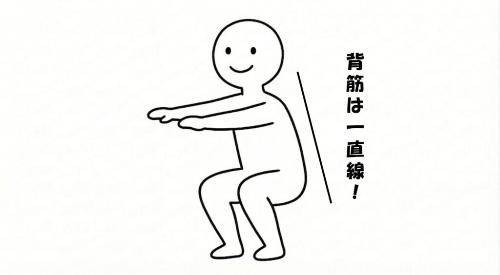 しゃがんでいくときも体を上げるときも、背筋は常にまっすぐに保ってください。