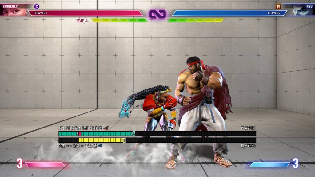 キンバリーは、立ち強キックをガードさせた後、少し距離が離れてしまい投げ間合い外になります。