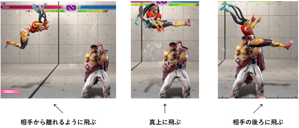 この技は、ヒットもしくはガード時に、3方向へのジャンプに派生することができます。